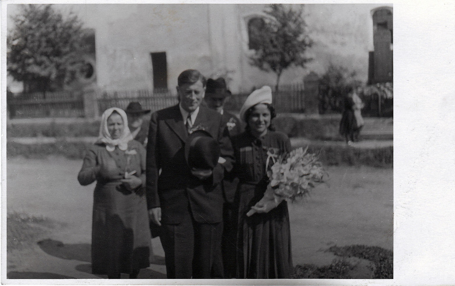 Popis fotografie: svatba Emilie Verostové a Eduarda Chvátala, v pozadí zleva Marie Chvátalová (žena Josefa), Františka Verostová (nevlastní matka Emilie), Josef Chvátal (svědek, bratr Eduarda)
