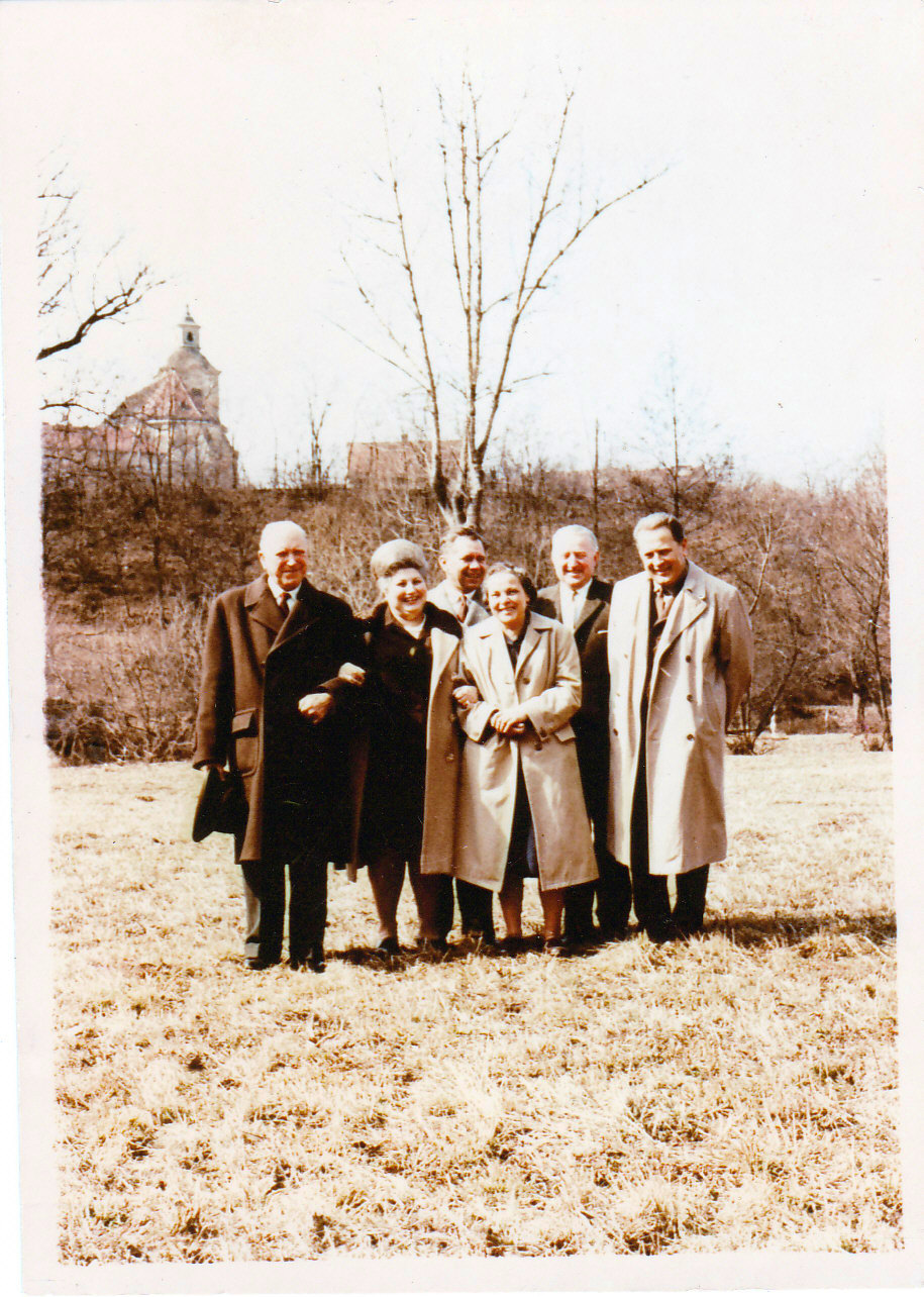 Popis fotografie: zleva Tomáš Pipal (švagr ze Silůvek), Anni Werosta (manželka bratrance z Vídně), Vlastimil Verosta (bratr Emilie), Emilie Chvátalová, Otto Werosta (bratranec Emilie z Vídně), Eduard Chvátal (první návštěva příbuzných z Vídně po mnoha letech – následkem uvolnění režimu)