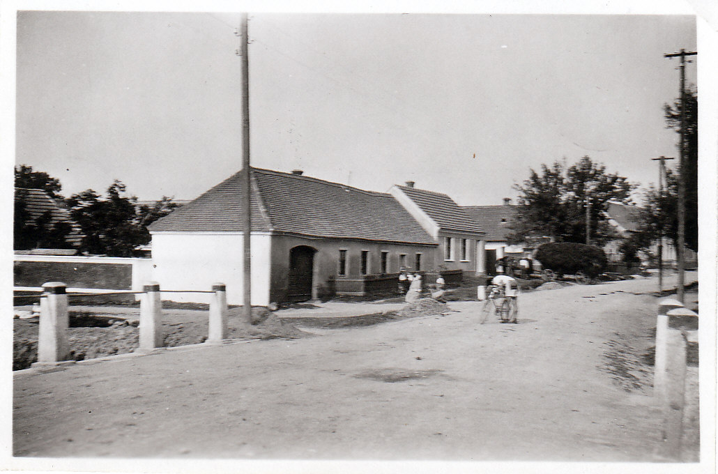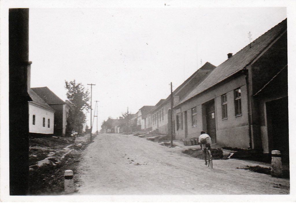 Popis fotografie:   pohled od mostku směrem ke kostelu. Druhý dům vlevo je č. 165 – výminek Břínkovi. V roce 1943 zde bydlela v podnájmu učitelka Emilie Verostová (1908-1995), kterou si později vzal Eduard za ženu.