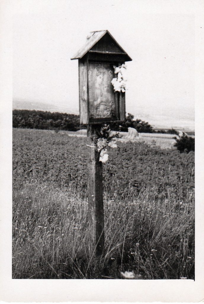 Popis fotografie:   Boží muka, v pozadí pole s postavenými panáky obilí